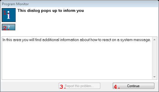 The dialog may show three icons: an Information icon if the dialog provides any information; a Warning icon if a non-critical problem was detected; a Stop icon if a critical error has occurred in the software.2. Help button