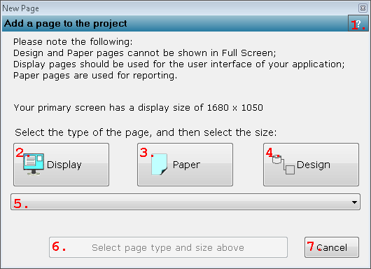 From this dialog, you select the kind of page that you want to add to the current project, and what size the page should have.First choose what kind of page you require: a Display page, Paper page or Design page.
