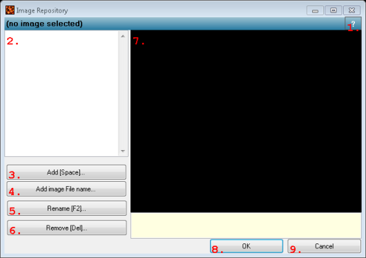 Adds a new image to the repository, which is stored as a file name. A name for the image is suggested, but you may change that as long as the name is unique. Note that the image file should be on every computer your application is run.5. Re name [F2]...