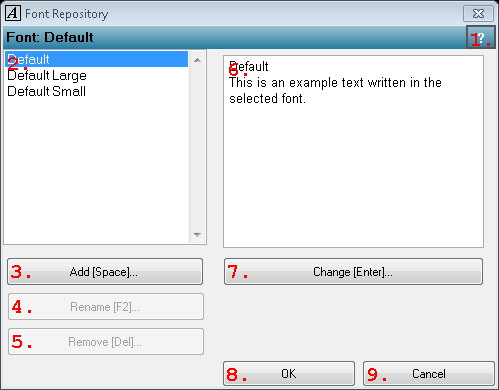 In the Font Repository you can edit a number of pre-defined text fonts as well as add new fonts.In this dialog, the font repository can be edited, new fonts can be defined, and existing ones can be modified.