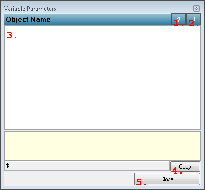 With this dialog, the Variable Parameters of an object can be viewed and copied. Also, in this dialog you can see what kind of values can be entered in a Variable Parameter.User Interface