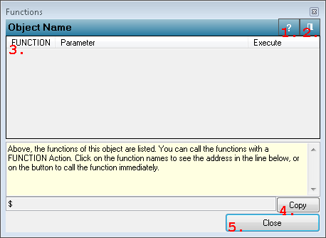 Some Polybench operators offer Functions, that can be called by using the FUNCTION action (link). This dialog shows which functions the operator offers, and tells the calling address of the functions.User Interface