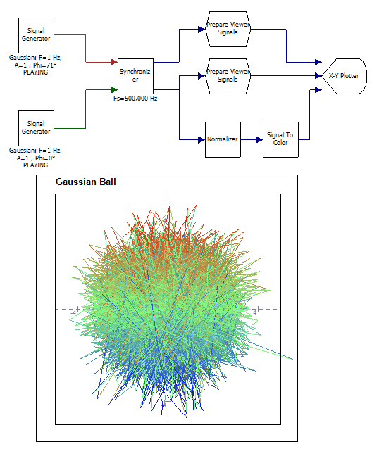 Demonstrates the X-Y Plotter. Two signal generators both generate gaussian noise. After synchronization, which is always required if you are using multiple signal sources, both noise signals are fed into the X and Y inputs of the X-Y Plotter. The Prepare Viewer SIgnal operators are used to set the signal range in the X-Y Plotter. The second signal is also used to make a pen color. The Signal To Color requires a signal that has a range between 0 and 1. Because the noise signal is ranges from approx. -5 to +5, a Normalizer is used to scale the signal. The Normalizer brings the signal range and offset to be between 0 and 1 at its output.