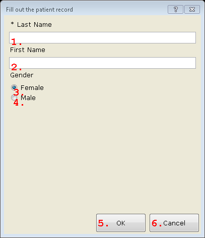 Accept the data entered for the patient. If any fields that have to be filled out are still empty, the dialog will not close.6. Cancel button