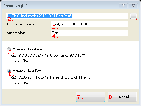 Using this dialog, you can import a single file as part of the measurements of the selected patient.The single file can be imported either as a new measurement, or as part of an existing measurement.