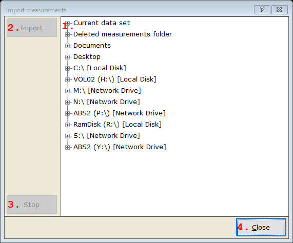 Then click on any of the green or yellow patient names or green measurement names to select them for importing. Press the Import button to start importing the selection in the current data set.