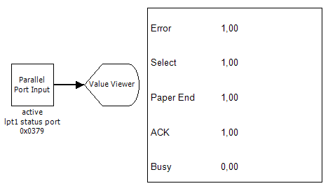 This operator forms a hardware connection via the standard parallel port (lpt printer port). The operator can only read values from the port, and cannot write values to the port.Operator ports