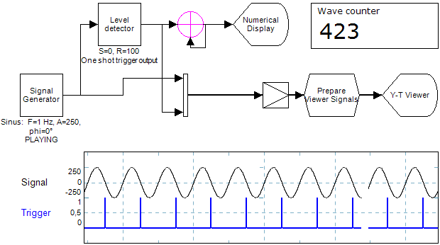 Below is a simple demonstration of getting a trigger from a signal. Since the trigger is only one sample period long, a feedbacked Adder can be used to count the triggers.