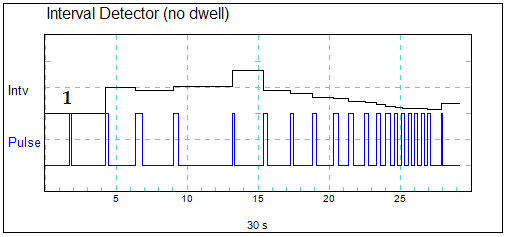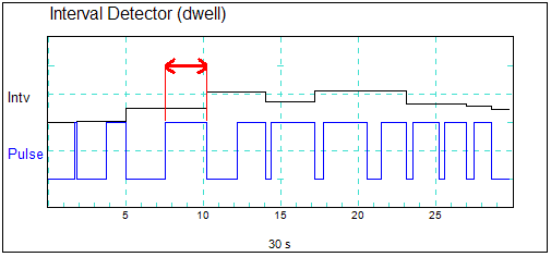 Dwell mode: the Interval Detector measures the time between the moment the Pulse signal goes from 0 to 1 and the moment it goes from 1 to 0 again. So, in effect the duration of the high value is calculated.