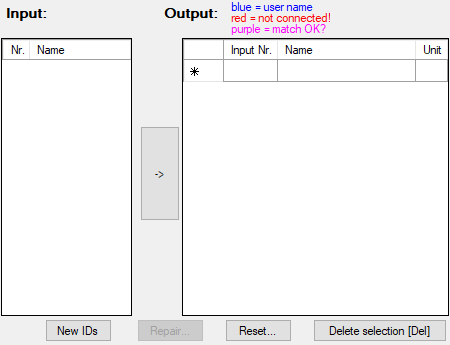 If you press the New IDs button, all output channels get a new channel identifier (ID). The channel IDs are important for viewer preparation operators (see "Viewer Channel Configuration (Preparation operators) Overview"), because they make that channels can be identified independently of their names or units. Note that by default, the channel IDs are equal to the IDs at the input, the first time the Channel Terminal was connected. If you see that behind a Channel Merger you have duplicate channel IDs (you can see this in the Signal Monitor Probe ("Signal Monitor Probe")), then you may use this function to give one of the merger's input a new, unique set of channel IDs.