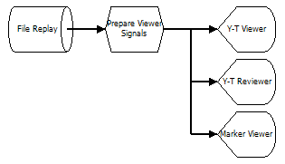 The File Replay operator is typically used in applications that do post-processing of measured data. The Replay is able to re-play the signals at their original speed (measured very precisely) or at a higher or lower speed. It is also able to replay blocks of data that are defined by Start Events and Stop Events and jump from one block to the next or previous, using the Next and Previous functions.The Replay is also able to provide reviewer components with stored data, like the Storage operator ("Storage") can do. This means that you can connect a live data viewer as well as a stored data reviewer at the same output, as is shown in the next figure: