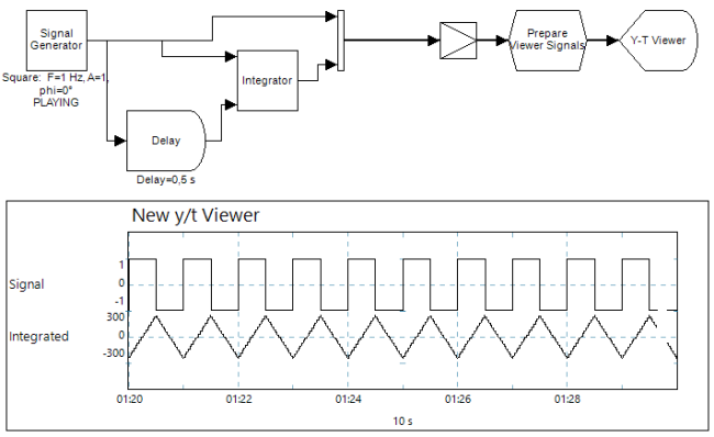 Simple demonstration of the Integrator operator. Using the Delay it is easy to make an integration with a running window with the length as set in the Delay operator.Because the sample rate of the Signal Generator is 500 samples/sec, the square is a signal of 1 Hz, and the Delay is set to 0.5 seconds, the triangle (running integral of the square) has an amplitude of 500.