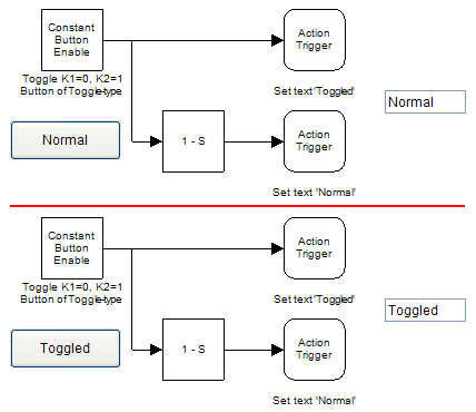 The following figure shows a configuration with a Constant Button ("Constant Button") and two Action Trigger operators ("Action Trigger"). The Action Trigger operator executes an action if at its input a signal changes from the value 0 to the value 1 (called a trigger). If the Constant Button is pressed, its output changes from 0 to 1, thus inducing a trigger for the upper Action Trigger. Because the lower Action Trigger operator gets the value from an Inverter operator (1 - S, "1 - S"), it will not trigger since its input changes from 1 to 0.Now, the Constant Button is set as Toggle button. If a user presses the button again, its output changes from 1 to 0 again, thus inducing a trigger on the lower Action Trigger.
