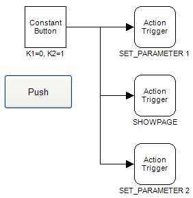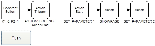 In this example the same three actions are executed from Action operators in an action sequence. The Action Trigger operator starts the action sequence. In this case, the order of execution is predictable: first comes SET_PARAMETER 1, then SHOWPAGE, and then SET_PARAMETER 2. Always.