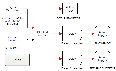 In this example the same three Action Triggers are triggered. This time they are triggered one after another, because the second and third one are executed after 1 and 2 samples delay. As a result, you can be certain that SET_PARAMETER 1 is executed before SET_PARAMETER 2. However, SHOWPAGE can still be executed at any time. It may even come before SET_PARAMETER 1, but also in between or after SET_PARAMETER 2.