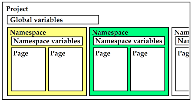 This figure shows the general build-up of an application. Shown is also that pages belong to a namespace (by default this is the namespace Main). Then there are global variables and free variables that are part of a namespace (read more here: "Free Global and Namespace Variables").