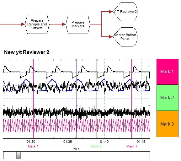 Events can be either hidden signal control features, or openly visible signal markers. The Events can be made visible using a number of objects. Y-T Viewers show event markers that are listed in the "Prepare Markers" operator immediately before the viewer. The "Marker Viewer" shows markers in a table. A Prepare Markers operator specifies which markers to list. The "Marker Button Panel" enables the end-user to drag markers into a Y-T Reviewer, so that events can be added or modified to a stored signal.