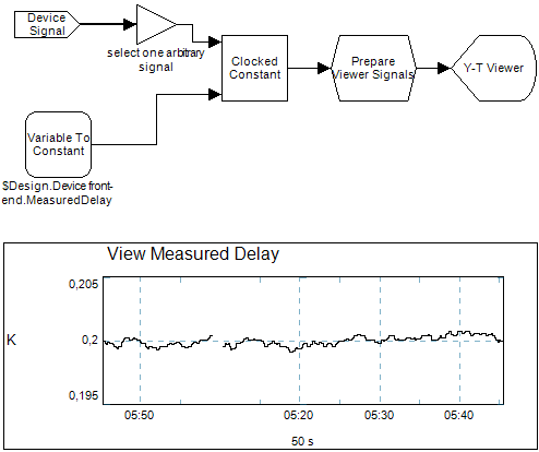 The Variable To Constant ("Variable To Constant") is used to read the MeasuredDelay parameter of the device operator. As can be seen, the DelayTime of this synchronized device is set to 0.2 sec. The time deviation lays within a range of +/- 1 ms, which is justifiable.