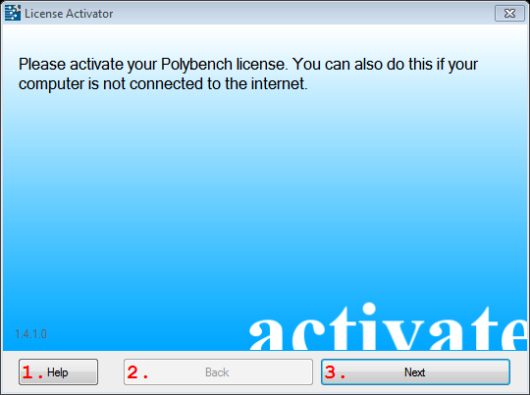 Now click <ACTIVATE> to activate Polybench. You may also cancel the activation and retry after the installation. Note that if your license is not activated, Polybench will not run.