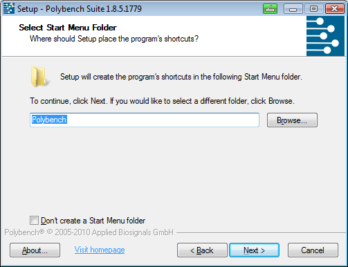 Next, specify a shortcut to the Polybench software in the Windows Start Menu. If you select <Don't create a Start Menu folder> the folder will not be created. Click <Next> to continue.