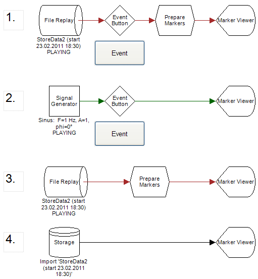 1. Shows a live data configuration, where event markers are added to the running signal when you press the Event button. Every next event marker is then shown in the Marker Viewer, if it is specified in the Prepare Markers operator. Notice that the signal file that is being replayed in the File Replay may also contain event markers!