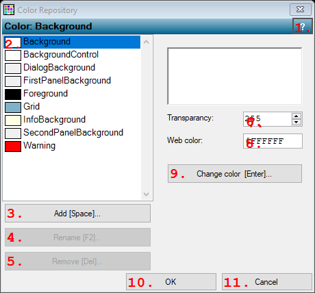In the Color Repository you can edit a number of pre-defined colors.In this dialog, the color repository can be edited, new colors can be defined, and existing ones can be modified.
