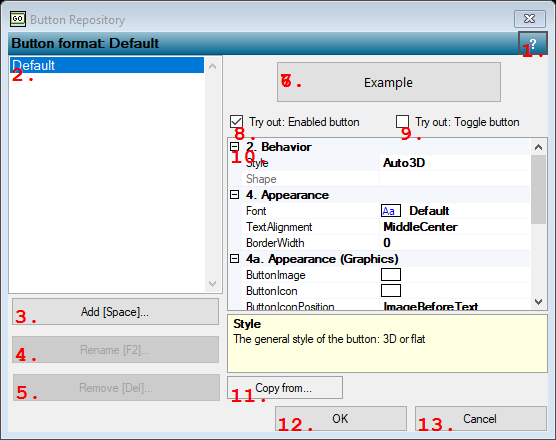In this dialog, the button repository can be edited, new button layouts can be added, and existing ones can be modified.