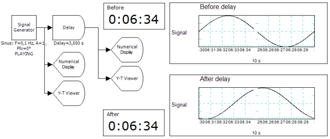A sample that is put into the delay component, is put out unchanged after some time delay. At start-up situations, before the delay time is reached, the output will remain unchanged.
