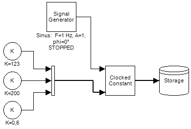 Constant values are used for all kinds of calculations, or to initialize a calculation with a preset. However, constants cannot be shown in a time viewer, such as the Y-T Viewer, because a constant sample does not have a time component. Also, constant values cannot be stored using a Storage operator ("Storage"), because constants are no signals.In order to convert a constant into a timed signal, you need the Clocked Constant. The Clocked Constant itself does not set a value, but it merely converts an existing constant into a signal that is derived from another signal in your project. The existing constant values are connected to the Constant input. The reference signal is connected to the Signal input.