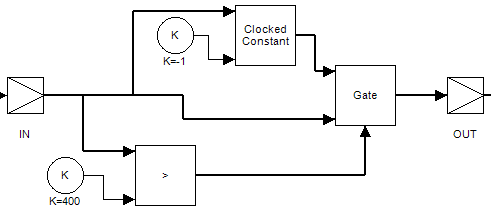 This example shows how values in a signal can be exchanged by a constant (default) value if some criterium has been fulfilled. In this case, if any of the input values becomes greater than 400, it is exchanged by -1. The exchanging of values is done using the Gate operator ("Gate"), which can switch between two input signals for each channel separately.