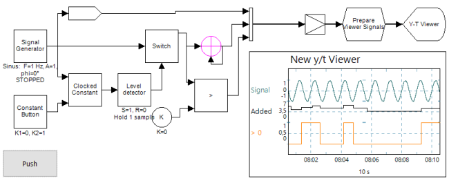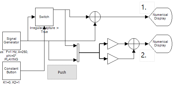 On the other hand, the breaking of the time line may also deliberately be used. You could write an application that picks single samples (by switching the Switch one sample period of time) from a signal and displays them in a X-Y Plotter, or stores them in a CSV file. Most math operators won't have a problem with signals with broken time lines, so you could do calculations on the 'picked' samples.