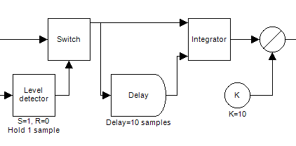 Notice the difference in using the Switch to capture single samples and the Sample and Hold operator ("Sample & Hold") to do similar things. Using the Switch, the captured sample is only one sample, whereas using the Sample and Hold, the captured values are repeated at the sampling frequency until the next values are captured. Using the Switch, for example, it is easier to calculate the mean of captured values, as shown in the next image: