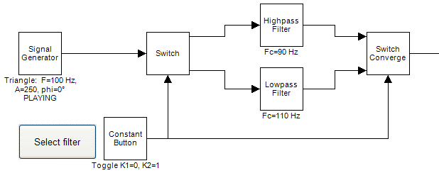 The schematic below shows an example of the Switch and "Switch Converge", that together form the equivilent of what in other computer languages would be called IF..THEN..ELSE. Using the constant button either the high pass filter, or the low pass filter is selected.