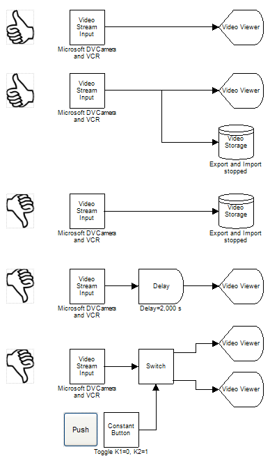 The image below shows some configurations that do work and that do not work: Note that you always need a Video Viewer - without a viewer no video source can be run!