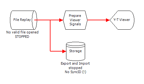 Open the properties of the Replay operator. Click on AbsolutePath to select a replay file. Search for the demo file 'PolybenchSample.Polygraphy.Poly5' (or another demo file) in the 'Help/Examples' folder in your installation folder (look in the Windows Program Files folder). Select it and close the dialog. The red arrows in the schematic have now become black.