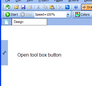 The blue area to the left opens the tool box if it is hit by the mouse cursor. In the designer menu you may change that behavior so that the tool box opens only if you click the blue area. You may also press F9. You can move the blue area up and down, just what is most convenient for you.