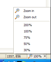 The zoom menu at the bottom of the screen. Click on the percentage value to quickly switch between 100%, 75% or 50%. Or click the arrow to open the zoom menu. You may also press Ctrl-plus or Ctrl-minus on your main keyboard.