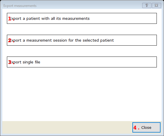 Choose to export the currently selected patient with all its measurements.2. Export a measurement session for the selected patient
