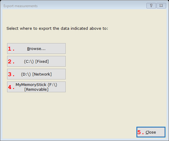Use this dialog to quickly copy data, for example to a USB-memory stick. Use the Import dialog ("Import Measurements") to import the data on another computer.