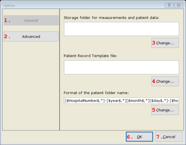 The most important setting is the Storage folder for measurements and patient data, which is a folder in which all new patient data and measurements are stored. The disk on which this folder is located should be large enough to hold many measurements. This setting should only be changed by a system administrator that is aware of the limitations of the computer system.