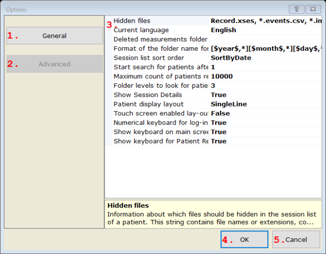 Information about which files should be hidden in the session list of a patient. This string contains file names or extensions, comma separated; for example: Record.xses, *.events.csv, *.jpg
