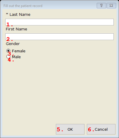 Accept the data entered for the patient. If any fields that have to be filled out are still empty, the dialog will not close.
