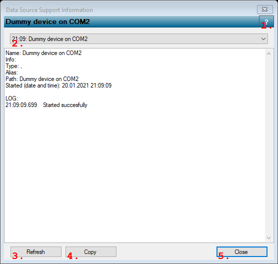 Information and logs are shown for all data sources and devices that are used in the current project, or that have been used in previously closed projects in the same instance of Polybench Designer.This information is mainly used for support purposes, or finding problems with devices.