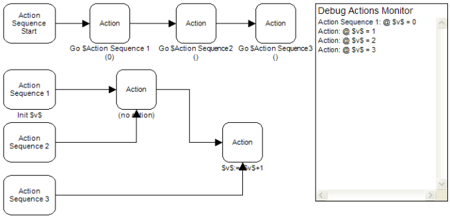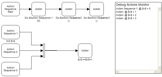 There are two ways action sequences can be merged to one action operator. The most common method is by using the lower input of the Action operator or the Action Sequence Start operator, as is shown in the next image.