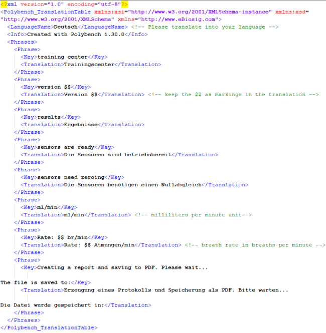 A translation file contains translation blocks, called phrases. Each phrase consists of a key, and a translation.The key is is the original text that is used in Polybench designer (what you have typed into the properties dialog), and that is written inside the .XMC file.