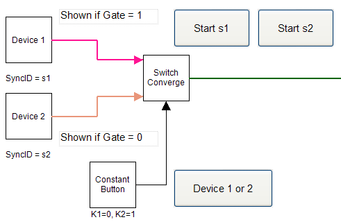 Since the Switch Converge can be connected to different data sources without any synchronization, it can be used to switch data sources. You could use this feature, for example, if you make an application with a hardware source and a file replay source, where the file replay source is used for demo or testing purposes, and the hardware source for real operation.