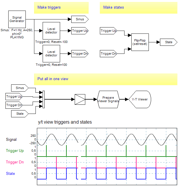 The Level Detector ("Level detector") is used to make two triggers of the signal. Note the Trigger and Reset settings of the Level Detector. Then, a Flip Flop (which actually is a basic memory element, "Flip-Flop (set/reset)") is used to make a state signal of the two triggers.