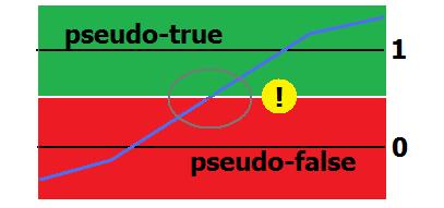 In Polybench, by definition a boolean 'False' (OFF) is 0, and a boolean 'True' (ON) is 1. But because the boolean values are actually just values in the Real domain (0.000... and 1.000...), the ON and OFF states are not precise. Therefore, in Polybench we often talk about pseudo-booleans. For example, in some cases 'True' is defined to be a value of close to 1, or greater than one, and 'False' to be a value of close to 0, or less than zero.