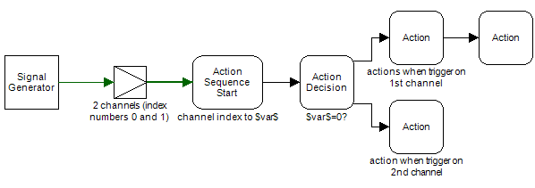 As an extra feature, the index or name of the channel that triggers the action sequence is optionally written to the address of the variable, as set in the property Address of variable. The first channel uses index 0.